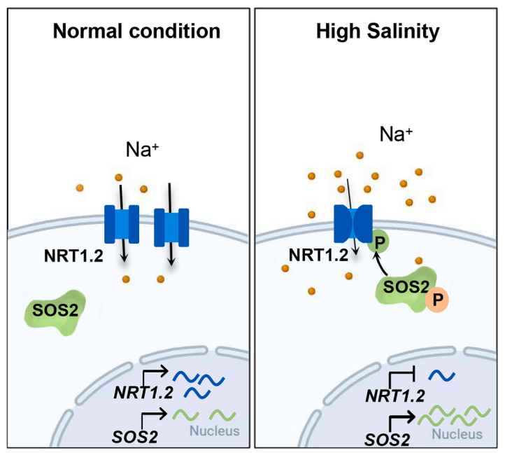該研究鑒定出NRT1.2/NPF4.6/AIT1是一種非選擇性鈉離子轉運體。擬南芥中過表達NRT1.2會因鈉離子積累而降低耐鹽性,而nrt1.2突變體提高耐鹽性。非損傷微測技術證實NRT1.2具有鈉離子吸收功能。在非洲爪蟾卵母細胞中,NRT1.2表現出依賴低pH值且受硝酸鹽促進的鈉、鉀、鋰離子轉運活性。進一步研究表明,鹽過敏感蛋白SOS2通過磷酸化NRT1.2第248位蘇氨酸(Thr248)抑制其鈉離子轉運活性。長期鹽脅迫可以誘導SOS2表達,而抑制NRT1.2的表達。因此,鹽脅迫條件下,植物通過誘導SOS2表達和激活SOS2激酶活性磷酸化NRT1.2,抑制NRT1.2的鈉離子轉運活性;另一方面植物通過降低NRT1.2的表達,降低NRT1.2轉運體數量;兩方面均可降低根系鈉離子吸收,提高植物的耐鹽性。