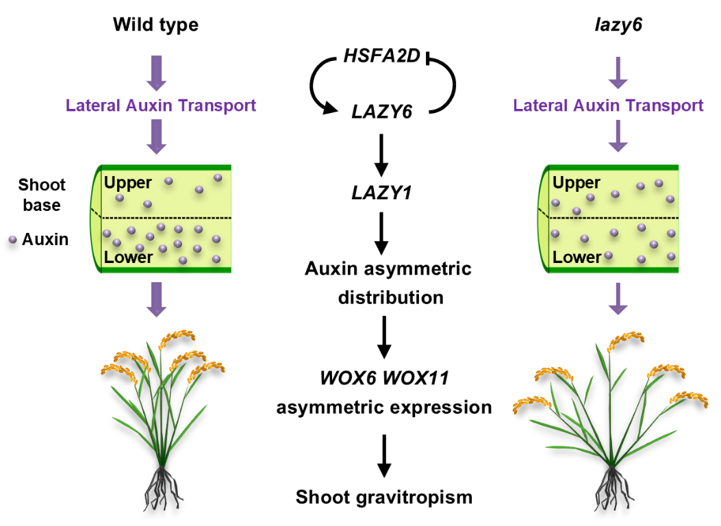 分蘗角度是作物株型的重要組成部分,對作物種植密度、群體光合效率以及最終產(chǎn)量具有重要影響。水稻分蘗角度的形成與重力反應(yīng)密切相關(guān)。解析其背后的分子調(diào)控機(jī)制,不僅有助于揭示植物感知和響應(yīng)重力的基本生物學(xué)過程,更對提高水稻群體產(chǎn)量具有指導(dǎo)意義。王永紅教授團(tuán)隊(duì)長期致力于水稻株型研究,圍繞重力反應(yīng)調(diào)控的水稻分蘗角度系統(tǒng)開展研究,揭示了以HSFA2D-LA1-WOX6/11為核心的水稻分蘗角度遺傳調(diào)控途徑。近日,該團(tuán)隊(duì)與山東農(nóng)業(yè)大學(xué)農(nóng)學(xué)院張寧教授團(tuán)隊(duì)合作,在《New Phytologist》發(fā)表了題為“HSFA2D-LAZY6—LAZY1 module regulates shoot gravitropism and tiller angle in rice”的研究論文,揭示了LA6作為連接HSFA2D與LA1的關(guān)鍵因子調(diào)控水稻分蘗角度的分子機(jī)制,進(jìn)一步完善了水稻分蘗角度的遺傳調(diào)控網(wǎng)絡(luò)。