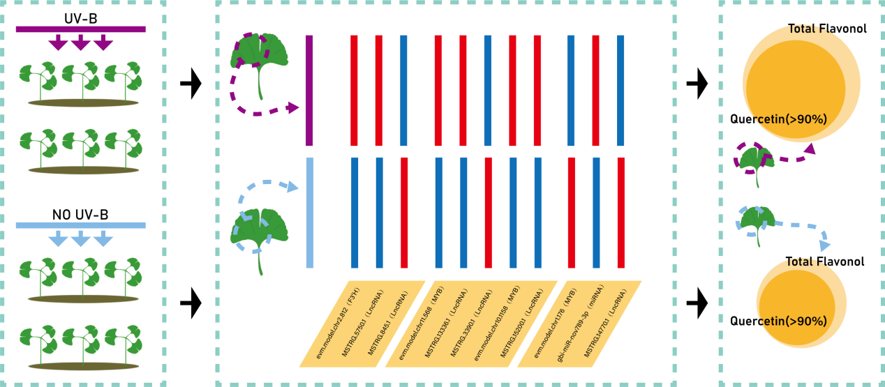 隨著環(huán)境紫外線(UV)強(qiáng)度的增強(qiáng),紫外脅迫成尤其是紫外線B(UV-B)脅迫成為了在植物生長過程中不可忽視的環(huán)境因素。目前已有相關(guān)研究表明,銀杏可以通過類黃酮的積累來應(yīng)對(duì)UV-B脅迫,且調(diào)控銀杏類黃酮合成的結(jié)構(gòu)基因與轉(zhuǎn)錄因子也被廣泛的發(fā)掘并研究。然而在UV-B輻射下LncRNA-miRNA-mRNA協(xié)同調(diào)控銀杏類黃酮合成的分子機(jī)制尚不明確。