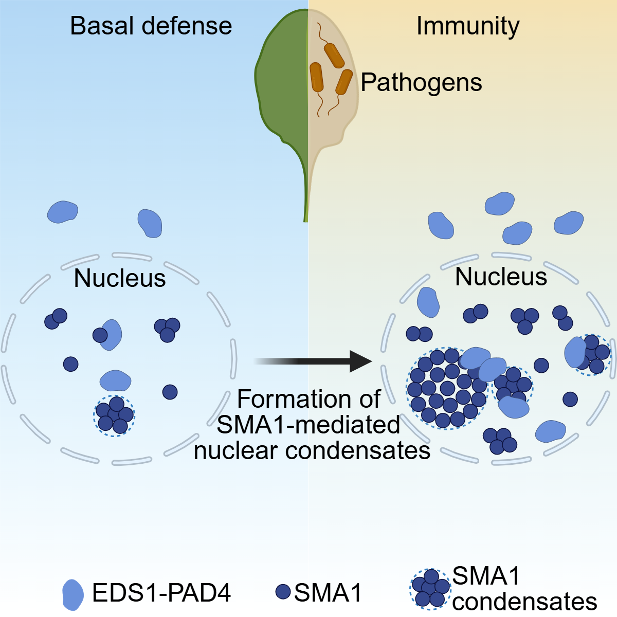 DEAD-box 蛋白在真核生物中普遍存在,參與RNA代謝,并在植物生長(zhǎng)發(fā)育和逆境響應(yīng)中發(fā)揮關(guān)鍵作用。在前期研究中,李勝軍團(tuán)隊(duì)分離出一個(gè)SMA1的點(diǎn)突變體sma1-1,并揭示了SMA1在調(diào)控RNA內(nèi)含子可變剪切和miRNA合成中的重要功能(Li et al., Nucleic Acids Research2018)。在此基礎(chǔ)上,該團(tuán)隊(duì)通過(guò)基于EMS誘變的sma1-1抑制子篩選,鑒定到一個(gè)能夠部分恢復(fù)sma1-1生長(zhǎng)缺陷表型的抑制子(ssma2),MutMap分析發(fā)現(xiàn)在免疫受體蛋白SNC1編碼基因中存在突變。隨后的生化和遺傳學(xué)等實(shí)驗(yàn)進(jìn)一步證實(shí),SMA1能夠與SNC1下游的EDS1-PAD4復(fù)合體在細(xì)胞核內(nèi)直接互作。尤為重要的是,該研究發(fā)現(xiàn)SMA1蛋白含有一段內(nèi)在無(wú)序區(qū)(IDR),該結(jié)構(gòu)域驅(qū)動(dòng)SMA1在細(xì)胞核內(nèi)通過(guò)“液-液相分離”發(fā)生聚集。當(dāng)植物受到病原體浸染或關(guān)鍵防御激素水楊酸刺激時(shí),SMA1在核內(nèi)的凝聚顯著增強(qiáng),并招募或與EDS1共同形成功能性復(fù)合體,進(jìn)而激活下游免疫相關(guān)基因的表達(dá),啟動(dòng)防御反應(yīng)。