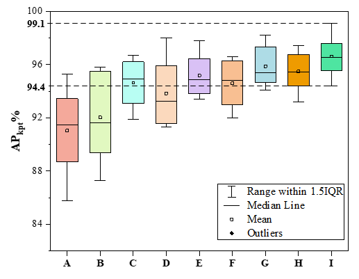 圖1 消融試驗(yàn)結(jié)果箱線圖。模型A-I分別對(duì)應(yīng)不同的改進(jìn)方法。