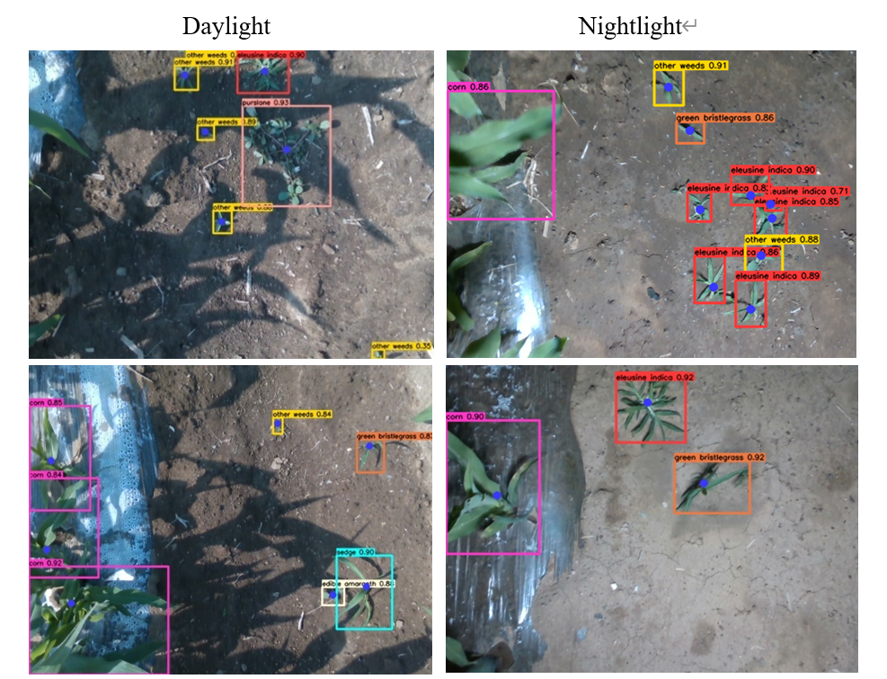 針對(duì)以上問題,本研究研發(fā)了一種準(zhǔn)確高效的雜草抑制方法,為田間精準(zhǔn)除草機(jī)器人的雜草識(shí)別系統(tǒng)提供技術(shù)支持。本研究首先針對(duì)田間存在的玉米苗與雜草之間相互遮擋、自然光線變化和雜草生長分布不均、設(shè)備資源有限等問題,構(gòu)建了SRD-YOLO網(wǎng)絡(luò)模型以實(shí)現(xiàn)玉米田間各類雜草的正確分類和各類雜草生長點(diǎn)的準(zhǔn)確定位。其次,精準(zhǔn)除草機(jī)器人根據(jù)獲得的雜草生長點(diǎn)的位置信息對(duì)生長點(diǎn)進(jìn)行精準(zhǔn)打進(jìn),以實(shí)現(xiàn)高效的雜草抑制。