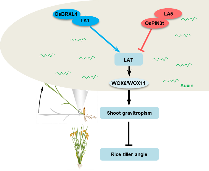 圖1.LA5調控水稻側向生長素運輸和分蘗角度新途徑的工作模型