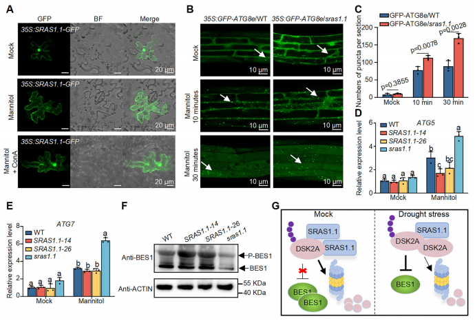 本研究研究通過遺傳學(xué)和分子生物學(xué)方法深入解析了SRAS1.1在干旱脅迫中的功能。研究者利用擬南芥的過表達(dá)株、突變體以及互補(bǔ)材料系統(tǒng)地比較了其干旱脅迫下的表型,結(jié)果發(fā)現(xiàn),sras1.1突變體在干旱條件下表現(xiàn)出顯著增強(qiáng)的耐旱性。在干旱脅迫下SRAS1.1的亞細(xì)胞定位會(huì)發(fā)生改變:它從細(xì)胞核轉(zhuǎn)移至細(xì)胞質(zhì),形成自噬小體。進(jìn)一步分子實(shí)驗(yàn)解析表明,SRAS1.1與自噬受體DSK2A直接互作,促進(jìn)其泛素化修飾并在26S蛋白酶體中降解。通過促進(jìn)DSK2A降解,調(diào)節(jié)BES1在干旱脅迫下含量,調(diào)節(jié)自噬反應(yīng)的平衡,進(jìn)而調(diào)控干旱脅迫響應(yīng)。