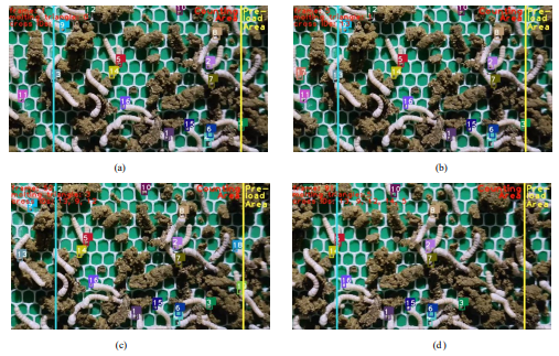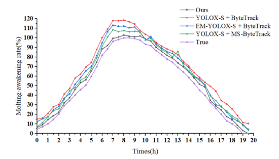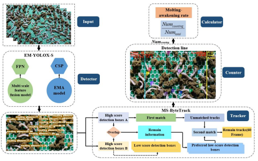 針對(duì)以上問題,團(tuán)隊(duì)提出了一種基于眠三角跟蹤檢測(cè)的小蠶眠起狀態(tài)監(jiān)測(cè)新方法。該方法基于優(yōu)化的目標(biāo)檢測(cè)器實(shí)現(xiàn)小蠶眠三角目標(biāo)的檢測(cè),在ByteTrack的基礎(chǔ)上提出了重合檢測(cè)框匹配法,解決了小蠶頭部交錯(cuò)以及飼料遮擋導(dǎo)致檢測(cè)框頻繁切換的問題。同時(shí),創(chuàng)新提出一種“檢測(cè)線 ”法來解決由于小蠶活動(dòng)而導(dǎo)致的重復(fù)計(jì)數(shù)問題,最終實(shí)現(xiàn)了小蠶眠起率的準(zhǔn)確獲取。使用該方法得到的眠起率趨勢(shì)也與真實(shí)趨勢(shì)保持高度一致。