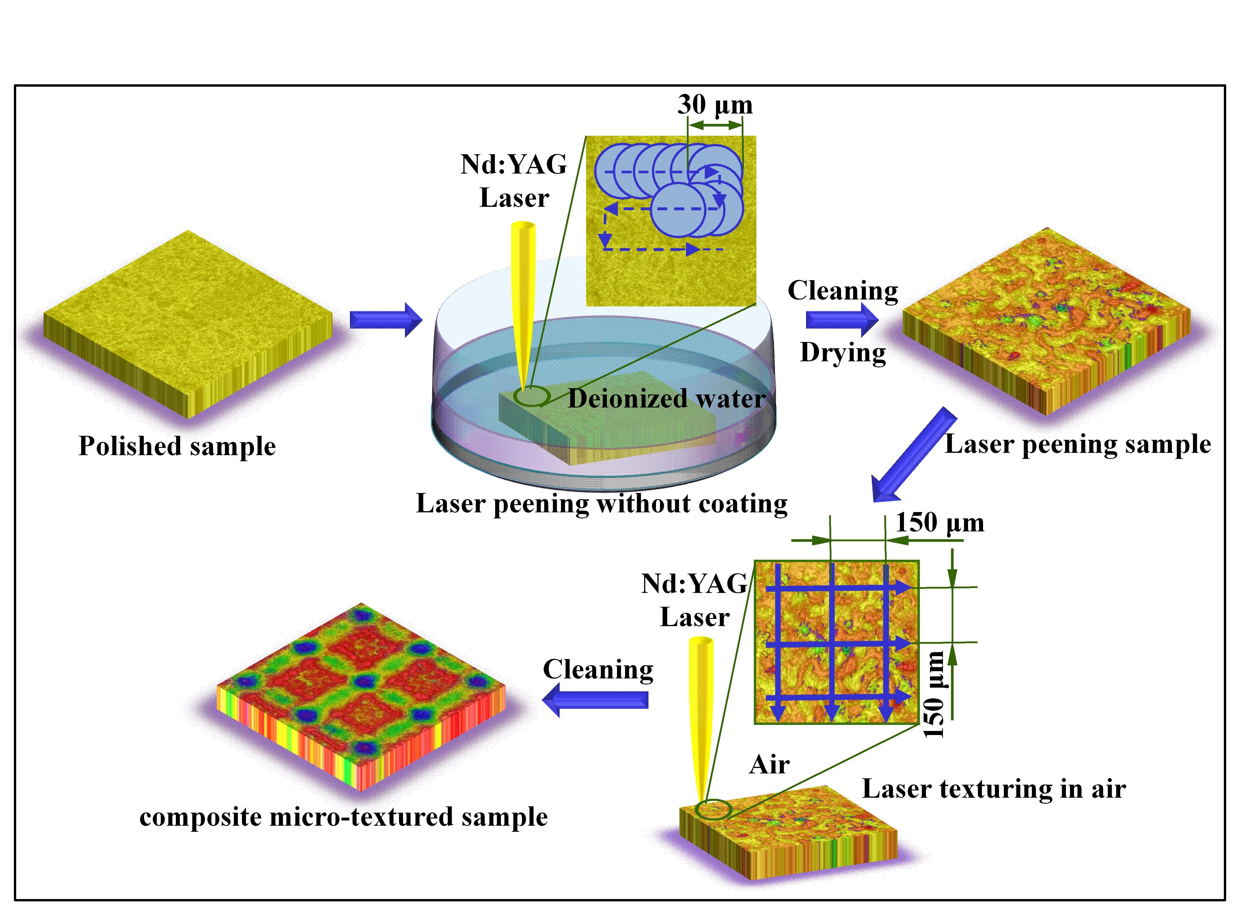 針對以上技術難題,團隊提出了一種結合激光噴丸和織構化加工的新工藝,在YG8硬質合金表面制備復合微織構。通過對試樣表面的微觀結構、粗糙度、硬度、殘余應力、摩擦磨損性能和切削性能的試驗研究,發現復合微織構表面展現出最優異的物理機械性能。該研究為硬質合金表面改性提供了新的思路和方法,通過優化表面特性大幅提升了硬質合金性能,有望在高性能切削工具和農機耐磨部件的制造中得到廣泛應用。