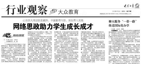 7月5日,大眾日報以《網絡思政助力學生成長成才》為題刊發報道,介紹山東農業大學主動適應90后大學生學習生活的“網絡化”特點,用活信息載體,豐富教育內容,突出育人實效的經驗做法。