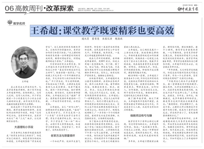 7月9日,中國教育報在“教學名師”欄目刊發題為《王希超:課堂教學要精彩也要高效》的人物通訊,稱贊我校信息學院高等數學課教師王希超專注教書育人,不僅精于課堂教學,更在教學中鑄造出優良師德師風,贏得學生愛戴。