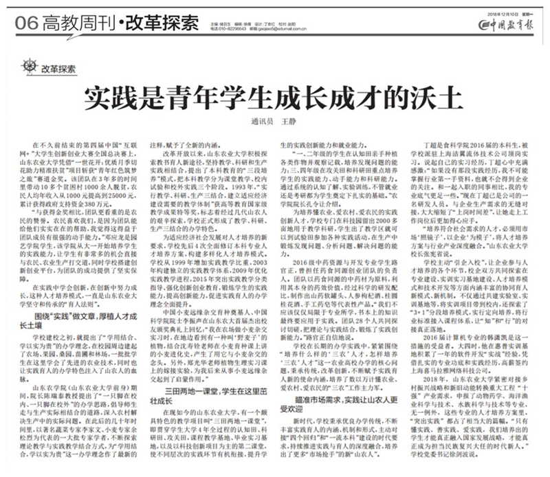 12月10日,《中國教育報(bào)》在《改革探索》版面刊發(fā)題為《實(shí)踐是青年學(xué)生成長成才的沃土》文章,詳細(xì)報(bào)道山東農(nóng)業(yè)大學(xué)堅(jiān)守和傳承實(shí)踐育人特色,在實(shí)踐中培養(yǎng)擔(dān)當(dāng)民族復(fù)興大任時(shí)代新人的特色做法。文章從“圍繞實(shí)踐做文章,厚植人才成長土壤”“三田兩地一課堂,學(xué)生在這里茁壯成長”“瞄準(zhǔn)市場(chǎng)需求,實(shí)踐讓山農(nóng)人更受歡迎”3個(gè)角度切入,通過大量鮮活的實(shí)例,全景展現(xiàn)了學(xué)校推進(jìn)實(shí)踐教學(xué)改革的歷史脈絡(luò)和育人成效,為山東農(nóng)業(yè)大學(xué)引導(dǎo)青年學(xué)生“在實(shí)踐中學(xué)會(huì)創(chuàng)新,在創(chuàng)新中努力成長”的“育人法則”點(diǎn)贊!