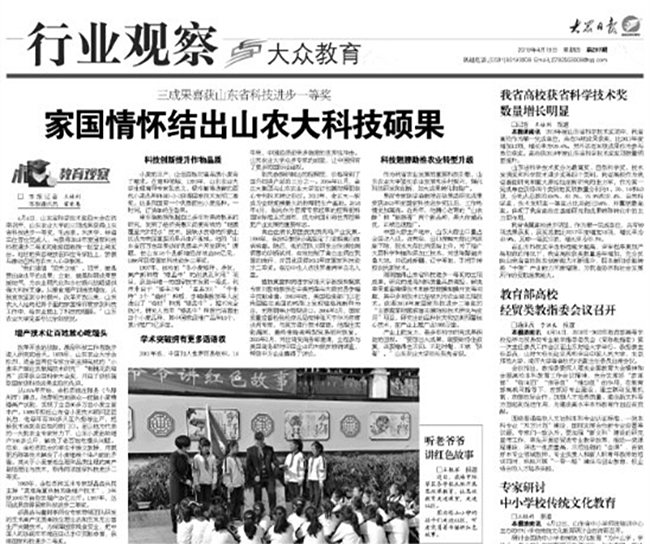 4月18日,《大眾日報》刊發通訊文章,以我校獲得3項2018年度山東省科技進步一等獎為切入點,介紹學校倡樹“頂天立地”科研理念,引導專家教授根植家國情懷,在服務經濟社會中取得豐碩科技成果的生動實踐。