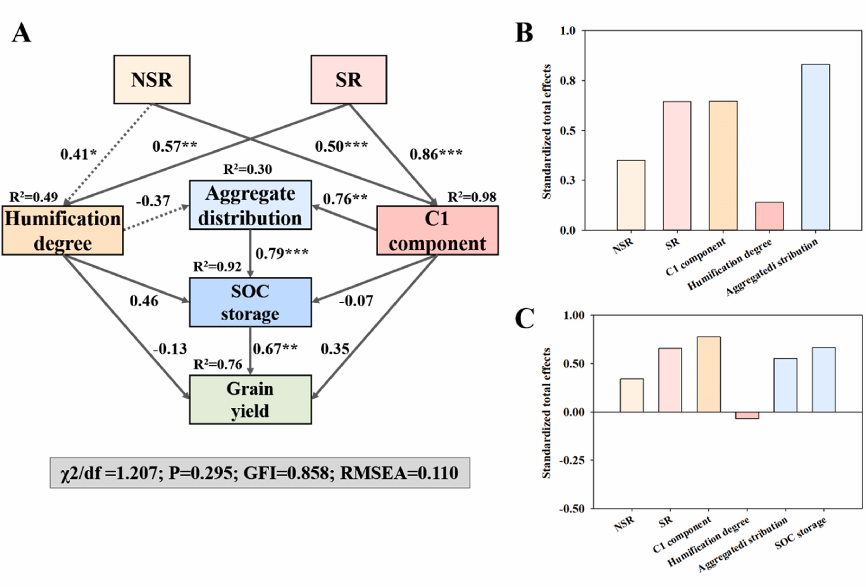 通過結構方程模型(SEM)比較了不同農業模式對土壤有機碳儲量和作物產量的影響(圖2)。結果表明,不同農業模式對土壤胡敏酸中C1組分均有顯著的積極影響,秸稈還田模式(SR)相比秸稈不還田模式(NSR)對土壤C1組分的直接影響更明顯。而C1組分也進一步影響了團聚體分布,最終團聚體分布提高了有機碳儲量和作物產量。