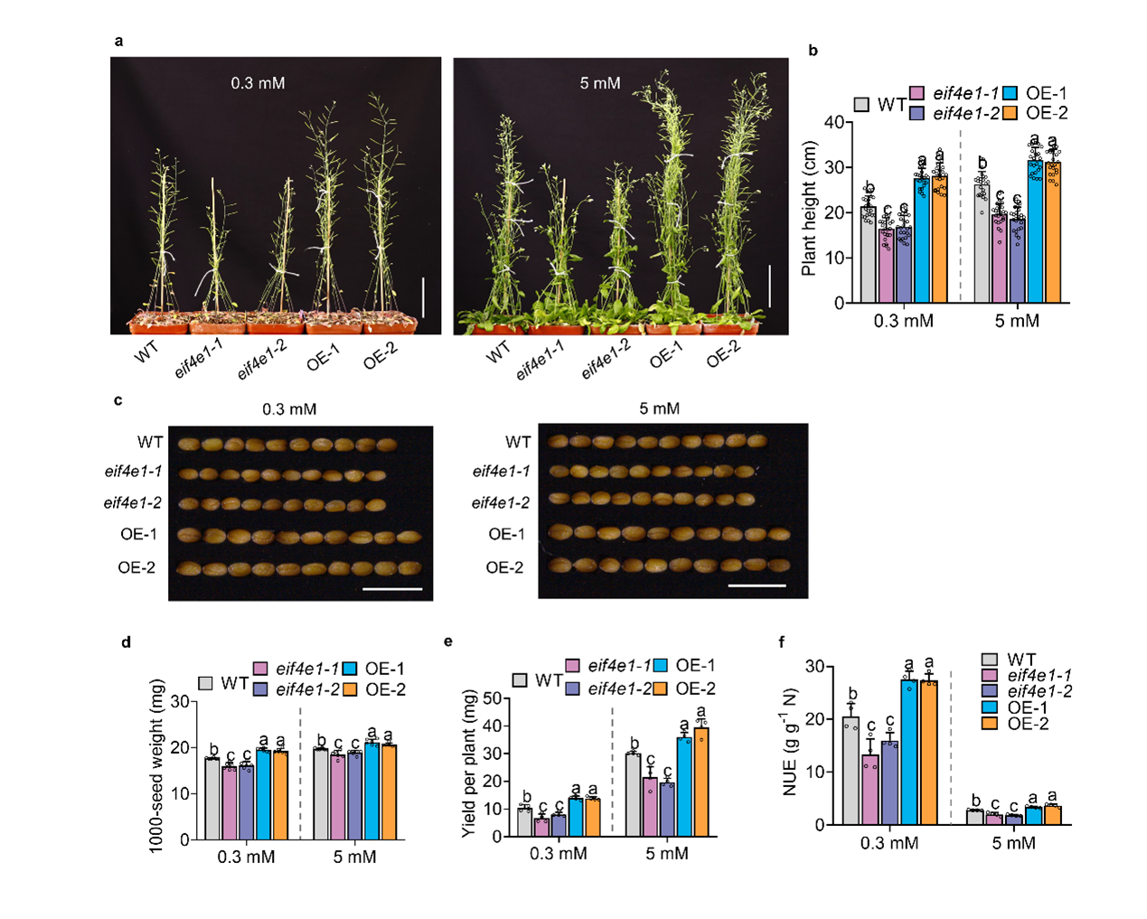 圖2 eIF4E1能夠促進擬南芥的生長,提高產(chǎn)量和NUE