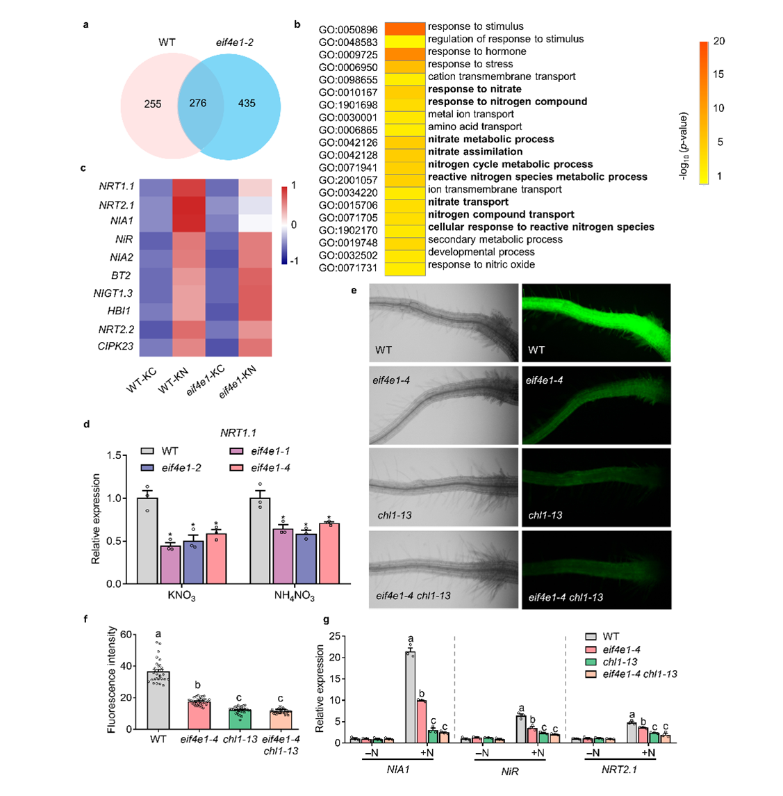 進一步研究發(fā)現(xiàn),eIF4E1調(diào)節(jié)硝酸鹽信號轉(zhuǎn)導(dǎo)和代謝。翻譯組測序(Ribo-seq)和多聚核糖體圖譜分析顯示,eIF4E1參與調(diào)節(jié)并促進一些氮相關(guān)mRNA的翻譯,尤其是在eif4e1突變體中硝酸鹽轉(zhuǎn)運蛋白NRT1.1正在翻譯的mRNA量明顯降低。RNA-Seq結(jié)果也表明,eIF4E1能夠調(diào)控一系列參與硝酸鹽信號轉(zhuǎn)導(dǎo)和代謝基因的表達。遺傳分析結(jié)果表明,eIF4E1在硝酸鹽信號轉(zhuǎn)導(dǎo)途徑中位于NRT1.1上游發(fā)揮作用。此外,eIF4E1與剪接體組裝因子GEMIN2互作,且GEMIN2同樣參與調(diào)節(jié)硝酸鹽響應(yīng)。過表達eIF4E1可顯著促進植株生長,提高產(chǎn)量和NUE。綜上所述,eIF4E1通過在翻譯和轉(zhuǎn)錄水平上調(diào)控NRT1.1來調(diào)節(jié)硝酸鹽信號轉(zhuǎn)導(dǎo),為未來在翻譯水平上研究礦物質(zhì)營養(yǎng)的調(diào)節(jié)奠定了基礎(chǔ)。