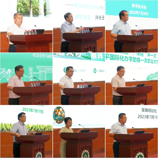 會上,教務處、研究生處、科學技術處、社會合作與成果轉化處、國際合作與交流處、人事處、農學院、園藝科學與工程學院、發展規劃處等代表9個專題工作組分別圍繞各自工作領域專題匯報了“十四五”發展規劃完成情況、“沖一流”建設的思路舉措。會議期間,各單位各部門就學習領會、傳達落實會議精神開展了專題學習研討。
