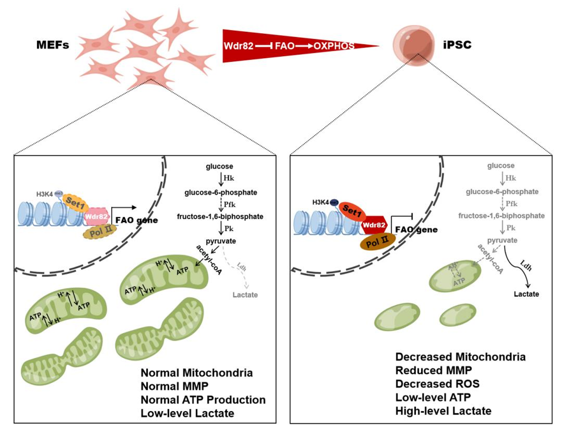 圖2. Wdr82抑制細胞氧化磷酸化過程、促進體細胞重編程的工作模式圖