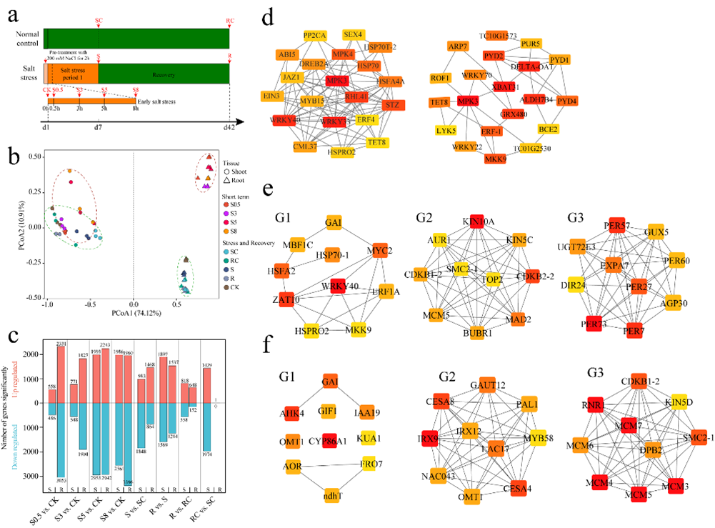全球每年約有10%的土地面臨鹽漬化威脅,我國(guó)鹽漬化土地約15億畝。山東鹽堿地889萬(wàn)畝,其中,黃河三角洲地區(qū)鹽堿地占698萬(wàn)畝。檉柳(Tamarix chinensis)具有較高的耐鹽堿脅迫能力,是黃河三角洲濱海鹽漬濕地生態(tài)系統(tǒng)的重要樹(shù)種。由治理鹽堿地適應(yīng)植物,向選育耐鹽堿植物適應(yīng)鹽堿地轉(zhuǎn)變,是挖掘鹽堿地開(kāi)發(fā)利用潛力的戰(zhàn)略舉措。楊克強(qiáng)教授團(tuán)隊(duì)利用PacBio和Hi-C測(cè)序技術(shù),從頭組裝了檉柳染色體水平的基因組,對(duì)檉柳水培苗鹽脅迫處理和恢復(fù)階段的根、莖組織進(jìn)行了轉(zhuǎn)錄組分析。測(cè)序組裝的檉柳基因組大小為1.32 Gb,scaffold N50達(dá)110 Mb,99.53%的序列定位到12條染色體上,基因組完整度達(dá)97.4%,基因組QV達(dá)39.03;基因組包含24,211 (91.62%)個(gè)可注釋的編碼基因。進(jìn)化分析顯示,檉柳在早第三紀(jì)(Palaeogene)的3,988 ± 1,295 萬(wàn)年前發(fā)生了全基因組復(fù)制(WGD)事件。WGD和串聯(lián)重復(fù)(TD)基因與檉柳對(duì)鹽脅迫的適應(yīng)性相關(guān),HAT和LIMYB基因家族成員顯著擴(kuò)張(圖1)。鹽脅迫和恢復(fù)階段根和莖組織的轉(zhuǎn)錄組分析表明,在鹽脅迫條件下,根和莖呈現(xiàn)不同的基因表達(dá)譜。Hub基因分析顯示,WRKY33/40、MPK3/4和XBAT31基因在鹽脅迫早期響應(yīng)中起關(guān)鍵作用,WRKY40、ZAT10、AHK4、IRX9和CESA4/8基因在脅迫后期和恢復(fù)過(guò)程中參與檉柳鹽脅迫響應(yīng),編碼III類過(guò)氧化物酶的PER7/27/57/73基因和編碼DNA復(fù)制執(zhí)照因子的MCM3/4/5/7基因在鹽脅迫和恢復(fù)階段保持上調(diào)或下調(diào)表達(dá)(圖2)。研究組裝了高質(zhì)量的檉柳基因組,揭示了檉柳基因組進(jìn)化特征,挖掘了檉柳耐鹽關(guān)鍵基因,為檉柳抗鹽遺傳改良和抗鹽基因利用提供了基礎(chǔ)。