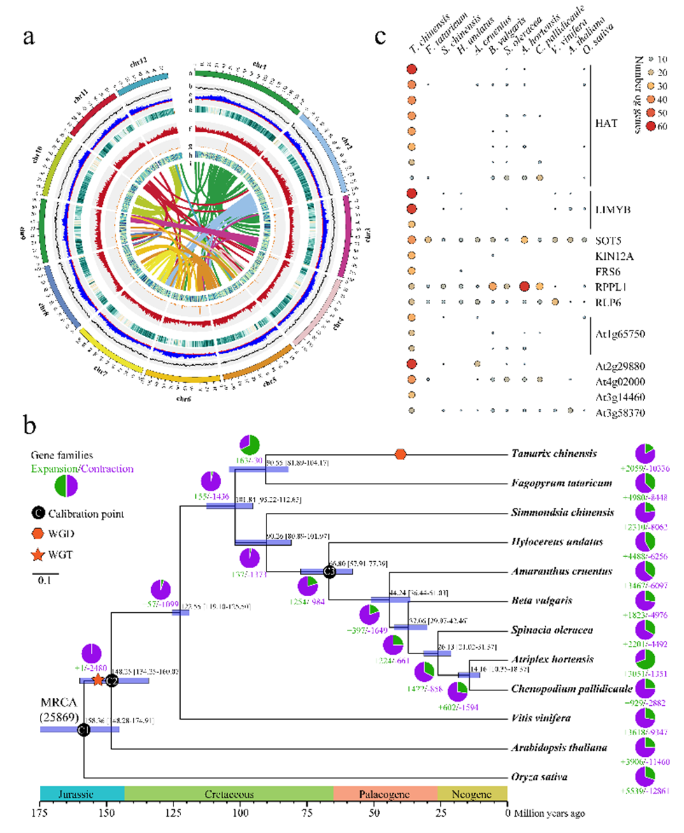 圖1 檉柳基因組特征及進(jìn)化分析
