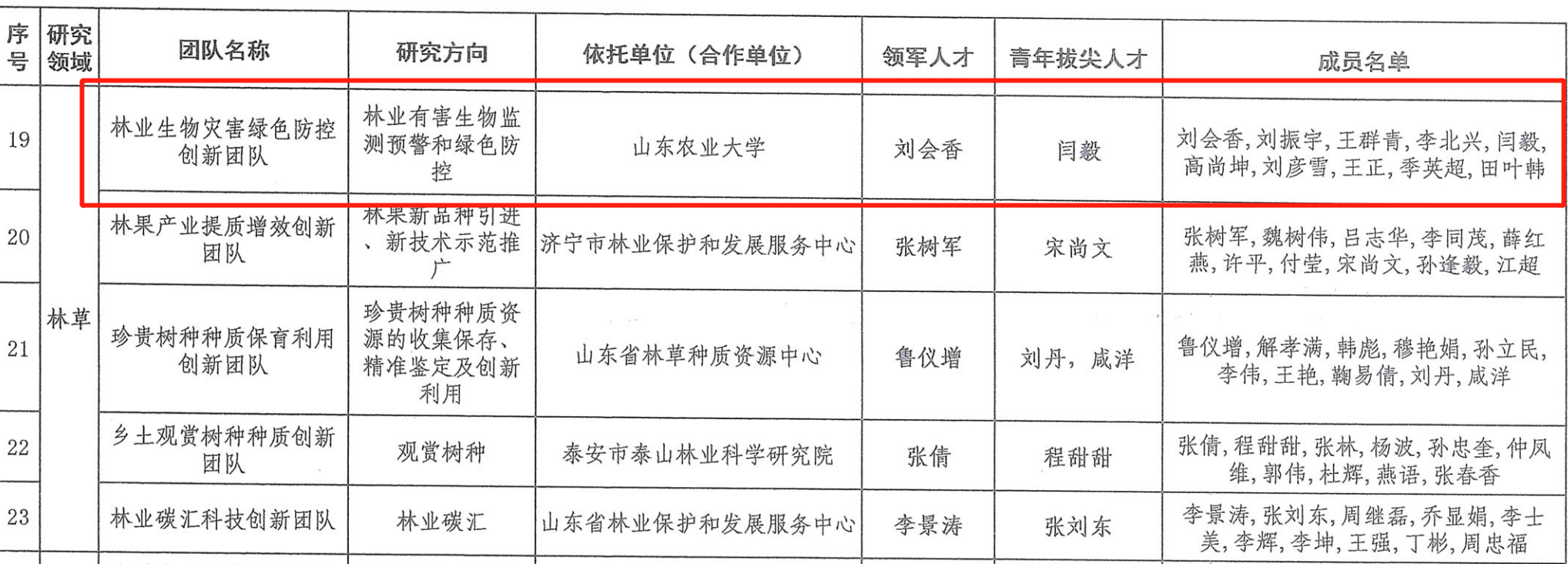 近日,山東省自然資源廳公布了山東省第一批自然資源高層次科技創新人才團隊名單,我校植物保護學院林業生物災害綠色防控創新團隊入選,團隊負責人劉會香教授入選領軍人才,團隊成員閆毅副教授入選青年拔尖人才。