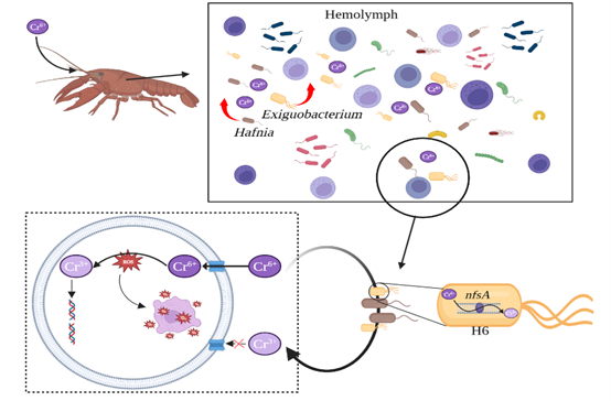 重金屬污染不僅影響人類的健康,也制約了現代農業的高效發展。重金屬污染嚴重的區域,動植物的生存受到限制。克氏原螯蝦常被用來監測重金屬污染,對重金屬具有較高的耐受性,但其潛在機制尚不清楚。六價鉻刺激誘使克氏原螯蝦血淋巴菌群改變,血淋巴中的優勢菌群(包括Exiguobacterium)將高毒性的六價鉻高效還原成低毒性的三價鉻,有效的緩解了重金屬對蝦的毒害作用。本研究揭示了甲殼動物耐受重金屬的分子機制,也可為重金屬區域開展養殖提供有力的理論參考。