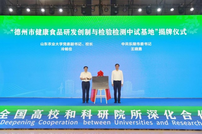 近日,學校受邀參加2023年全國高校和科研院所深化合作樂陵行活動。學校黨委副書記、校長冷暢儉與樂陵市委書記王曉勇共同為“德州市健康食品研發創制與檢驗檢測中試基地”揭牌。樂陵市委副書記、市長王峰陪同參加相關活動。