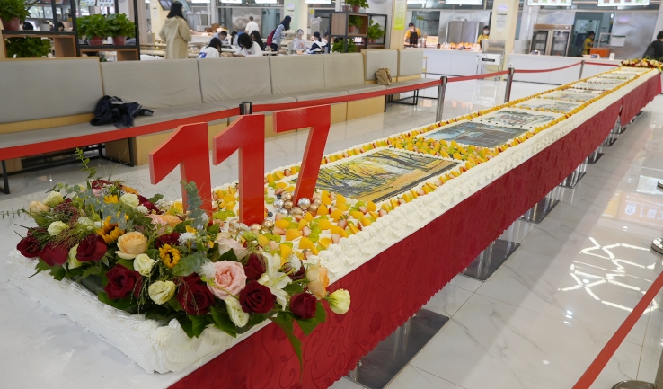 學校后勤管理處精心設計、傾情制作11.7米巨型慶生蛋糕,上有?;?、校訓、“117”校慶標識等元素。琳瑯精致的水果裝點、連綿不絕的奶油浪花象征著一代又一代“后浪們”涌入山東農業大學又奔赴遠方,代表著學校對莘莘學子們的美好祝福和期盼。蛋糕正上方由學校標志性景物手繪圖組成,兩側兩束盤花,寓意著山東農業大學117年不懈奮斗、砥礪前行,向著一流農業大學奮勇前進的精神風貌。