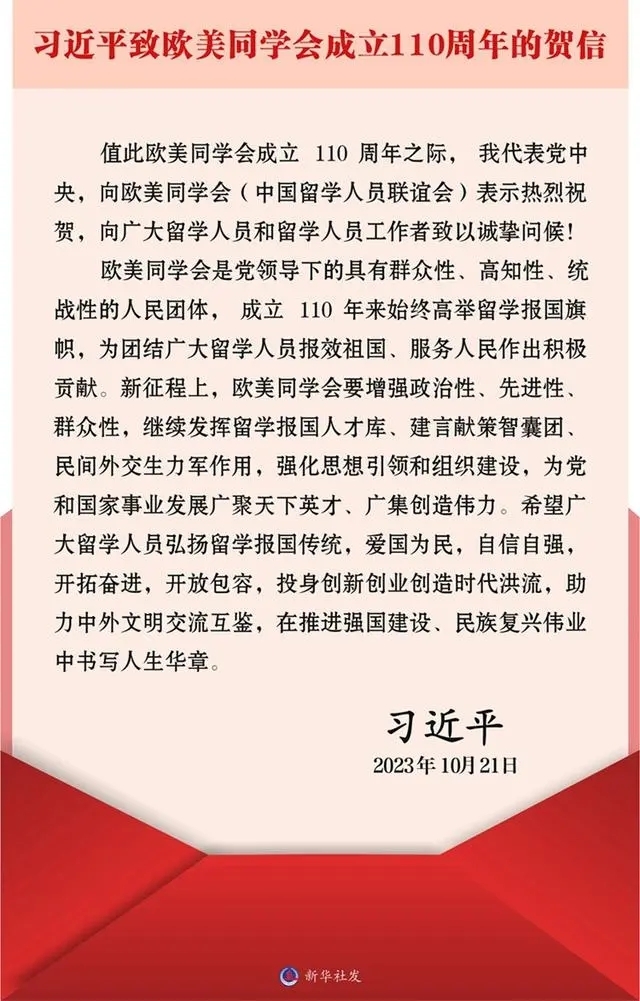 10月21日,歐美同學會成立110周年慶祝大會在京舉行。中共中央總書記、國家主席、中央軍委主席習近平發來賀信,充分肯定了歐美同學會作出的積極貢獻,深刻闡明了歐美同學會的使命任務,對廣大留學人員提出殷切期望,為做好新時代留學人員工作提供了根本遵循。