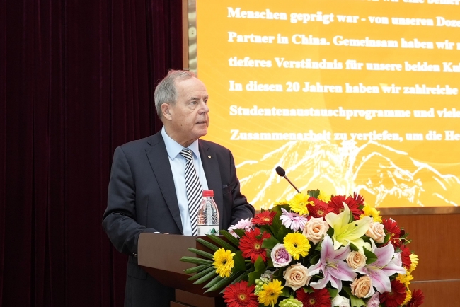 學院2008屆校友楊奕代表校友現場致辭;德國留學校友發來視頻表達對母校的祝福;四位國交學子用中德兩種語言表演詩朗誦《友誼》,為兩校20年的合作獻詞。