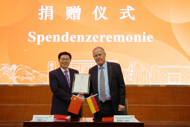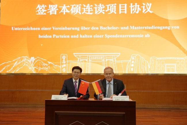 會議期間,冷暢儉與白瀟樂共同簽署《山東農業大學與德國埃森經濟管理應用技術大學本碩連讀協議》并進行捐贈儀式。校友會負責人宣讀成立德國校友組織籌備委員會的通知。