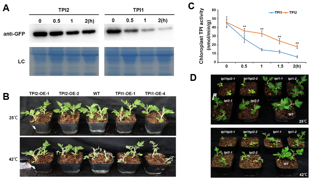 葉綠體磷酸丙糖異構酶(TPI)是碳同化過程中的關鍵酶,其在高溫脅迫下的穩定對于光合作用的維持十分重要。番茄中存在兩個TPI同源蛋白:SlTPI1和SlTPI2,兩者在正常生長條件下功能冗余:tpi1 tpi2雙突株系中光合蛋白損失嚴重,而tpi1或tpi2單突變體不具有明顯表型。但在高溫脅迫下,與SlTPI1相比,SlTPI2具有更好的熱穩定性。