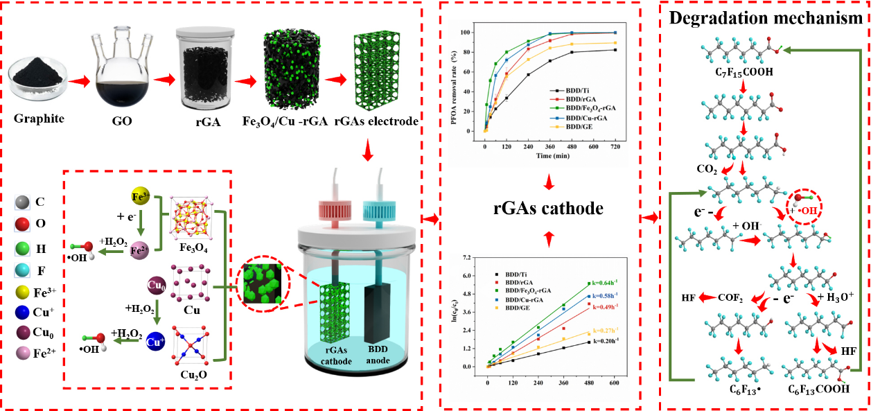 李成亮教授團隊長期從事環境中新興持久性有機污染物相關的研究,在新興污染物治理中取得了系列成果。本研究采用微泡模板法制備的Fe3O4-rGA和Cu-rGA為電化學氧化工藝提供了一種綠色、新穎的電極材料選擇,提出的陽極氧化和陰極多相類芬頓協同技術可高效降解水體中PFOA,在水環境中新興污染物治理方面具有廣闊的應用前景。