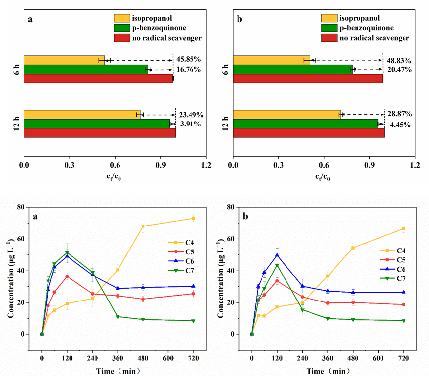 圖2. 自由基猝滅試驗與全氟辛酸電降解為短鏈全氟化合物濃度變化