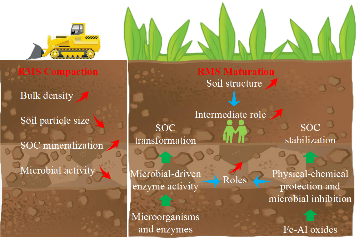 土壤有機碳的積累對復墾土壤的發(fā)育及其生態(tài)系統(tǒng)功能的恢復至關重要。為了優(yōu)化復墾管理實踐,研究旨在從系統(tǒng)的視角探究影響復墾土壤有機碳及其組分恢復的關鍵因素和內在機理。以中國東部煤礦區(qū)的采煤塌陷區(qū)為研究對象,將復墾耕地與周圍未塌陷耕地進行比較。結果表明,復墾過程中壓實破壞土壤結構產生的鏈式反應導致土壤容重增加、土壤顆粒細化、有機碳礦化增強以及微生物活動減弱。適應性更強的細菌群落對活性有機碳組分的利用在鏈式反應過程中發(fā)揮關鍵作用。土壤結構在復墾土壤生態(tài)系統(tǒng)中的中介作用突出,特別是對于碳循環(huán)過程。復墾土壤對土壤結構變化的響應更加敏感,微生物和酶對于土壤結構變化的響應成為關鍵。在復墾土壤碳循環(huán)過程中,微生物驅動的酶活性對于土壤結構的響應在有機碳轉化過程中至關重要,同時鐵鋁氧化物介導的物理化學保護和微生物抑制對有機碳穩(wěn)定的作用更為突出。