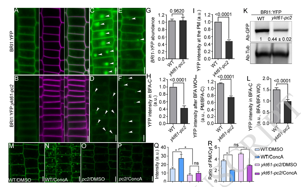 擬南芥YKT61是一種非典型的R-SNARE蛋白,不包含其他R-SNAREs所具有的跨膜(TM)結構域,因此它主要存在于細胞質。該團隊之前研究發現,YKT61的功能缺失導致雌/雄配子體致死(Ma et al., 2021)。本研究通過利用YKT61的弱突變材料-ykt61部分回補(ykt61-pc)株系,發現敲降YKT61導致因細胞分裂減少而造成的RAM長度變短,這與bri1-116突變體類似。YKT61與BRI1互作,對于BRI1靶向質膜的動態再循環至關重要。進一步分析表明,YKT61對液泡的動態生物發生、高爾基體形態的維持和內吞作用均十分重要,這也暗示它可能是一個植物整體生長和發育必須的基因。