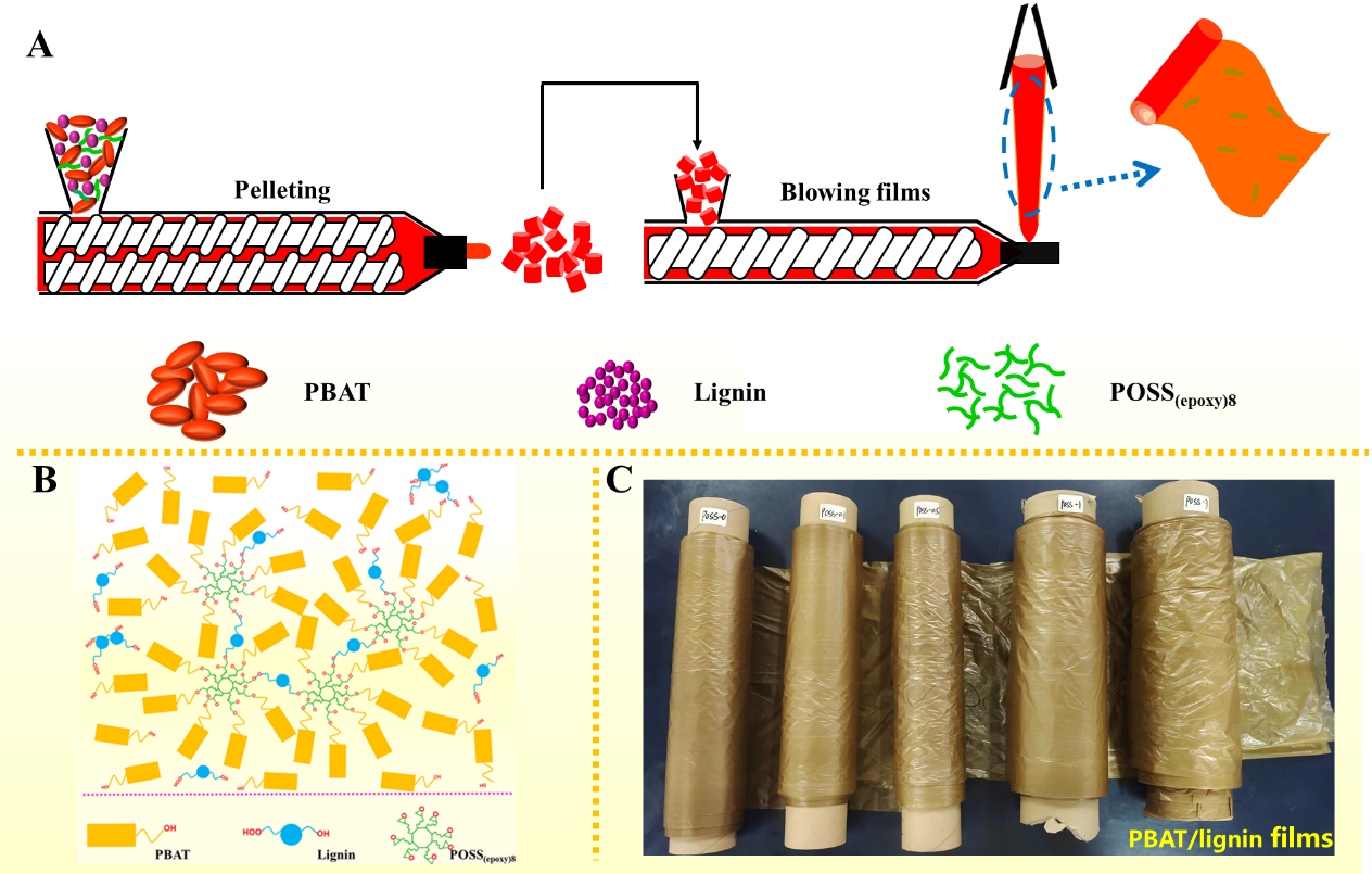 圖1:(A)PBAT/木質素薄膜制備流程圖,(B)PBAT、木質素和POSS(epoxy)8相互作用示意圖,(C)PBAT/木質素薄實物圖