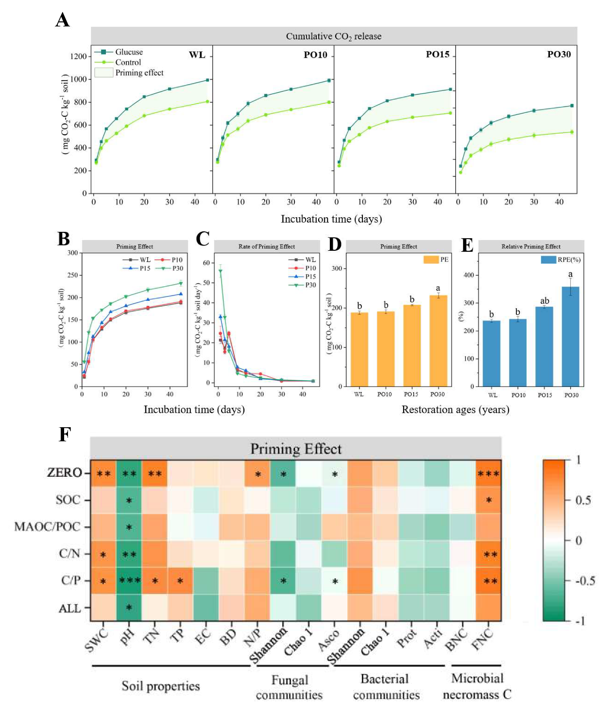 目前,以人工造林為主的植被恢復與防護林建設工程是緩解氣候變化、改善土壤碳庫質量、提高陸地生態系統固碳增匯功能的有效方法,植被恢復下土壤有機碳庫激發效應及其影響是其重要的關鍵機制。然而,不同年限植被恢復如何通過影響土壤碳庫穩定性,進而改變土壤激發效應的科學問題尚未得到解答。