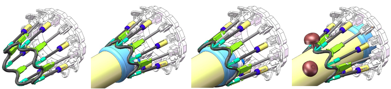 針對香菇生長密集、采摘易損傷、高速采摘等需求,該研究首創(chuàng)了香菇機械化采摘新模式,并創(chuàng)新設(shè)計了一種新型的香菇采收末端執(zhí)行器(圖1),實現(xiàn)低損傷、高效采摘。通過采摘過程動態(tài)過程(圖2)的力學(xué)分析和有限元分析,明確了采收過程中末端執(zhí)行器部件-香菇-菌棒的分離機理,優(yōu)化了末端執(zhí)行器的結(jié)構(gòu)設(shè)計和作業(yè)參數(shù),對提升采摘性能具有重要的理論指導(dǎo)作用。