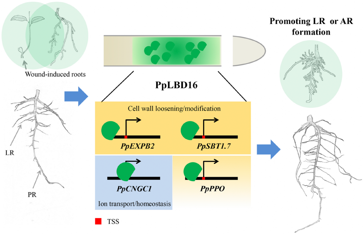 該研究提供了PpLBD16在桃根系中的轉錄調控網絡及其潛在靶基因,表明了PpLBD16在LR發育過程中靶向細胞壁修飾/離子轉運相關基因,為進一步探索LBD16及其他LBD轉錄因子調控植物根系發育的內在機制提供了研究方向。