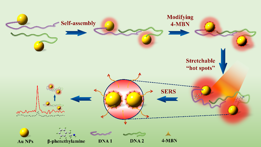 圖1. 適配體構(gòu)象介導金二聚體自組裝用于β-苯乙胺的SERS檢測示意圖