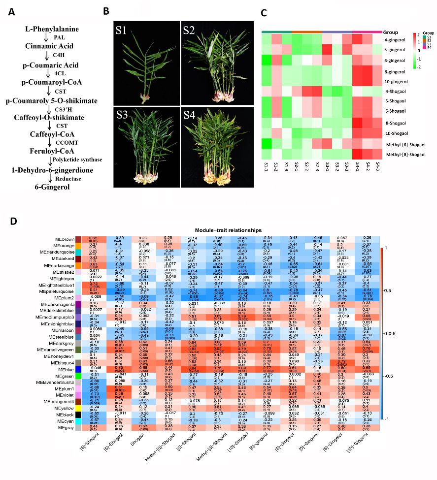 對‘萊蕪小姜’四個發育期的根莖進行了轉錄組和代謝組聯合分析,發現了6-姜酚的合成通路,解析了“姜還是老的辣”的機理。