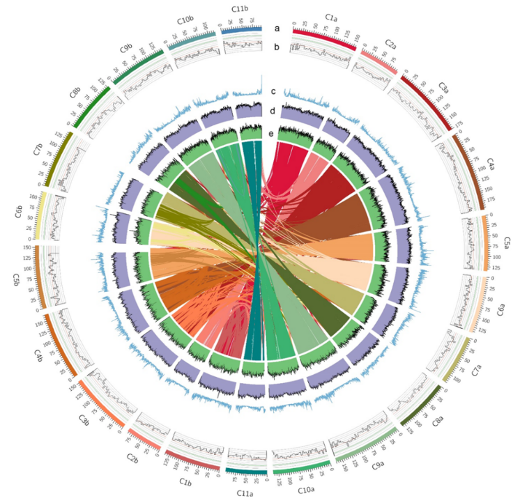 生姜是我國重要的特色出口蔬菜,具特殊辛辣風味,其姜辣素含量高低是評價生姜品質的主要指標,而6-姜酚是姜辣素的主要活性成分。該研究采用Pacbio方法完成了‘萊蕪小姜’全基因組測序,解析了其單倍型基因組序列,初步揭示了姜辣素的生物合成通路,為后續生姜功能研究和分子設計育種奠定了重要理論基礎。采用分型組裝成2套基因組A和B, A套為1.44Gb,B套為1.53Gb。A套的BUSCO值為94.62%,B套的BUSCO值為96.9%。