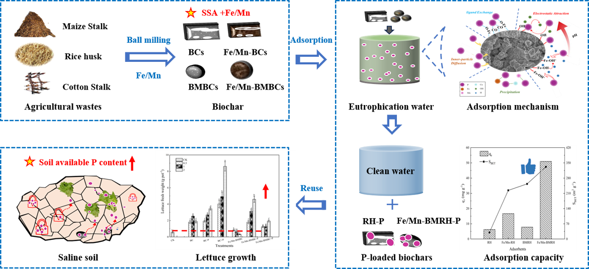 鹽漬農(nóng)田磷素有效性低是制約作物生長的常見問題之一,水體卻因為磷素過量引發(fā)水體富營養(yǎng)現(xiàn)象、大面積藻類繁殖,嚴重影響水體生態(tài)環(huán)境和生物多樣性。如何將富營養(yǎng)化水體中的磷素應(yīng)用于缺磷土壤逐漸引起環(huán)境和農(nóng)業(yè)工作者的關(guān)注。生物炭是污染水體修復(fù)常用的吸附材料,為了提高其吸附性能本研究嘗試利用球磨處理和金屬改性的方法,制備了具有更大比表面積和更好孔隙結(jié)構(gòu)的生物炭,吸附廢水中磷酸鹽然后回收用于鹽漬土壤提高磷素含量。