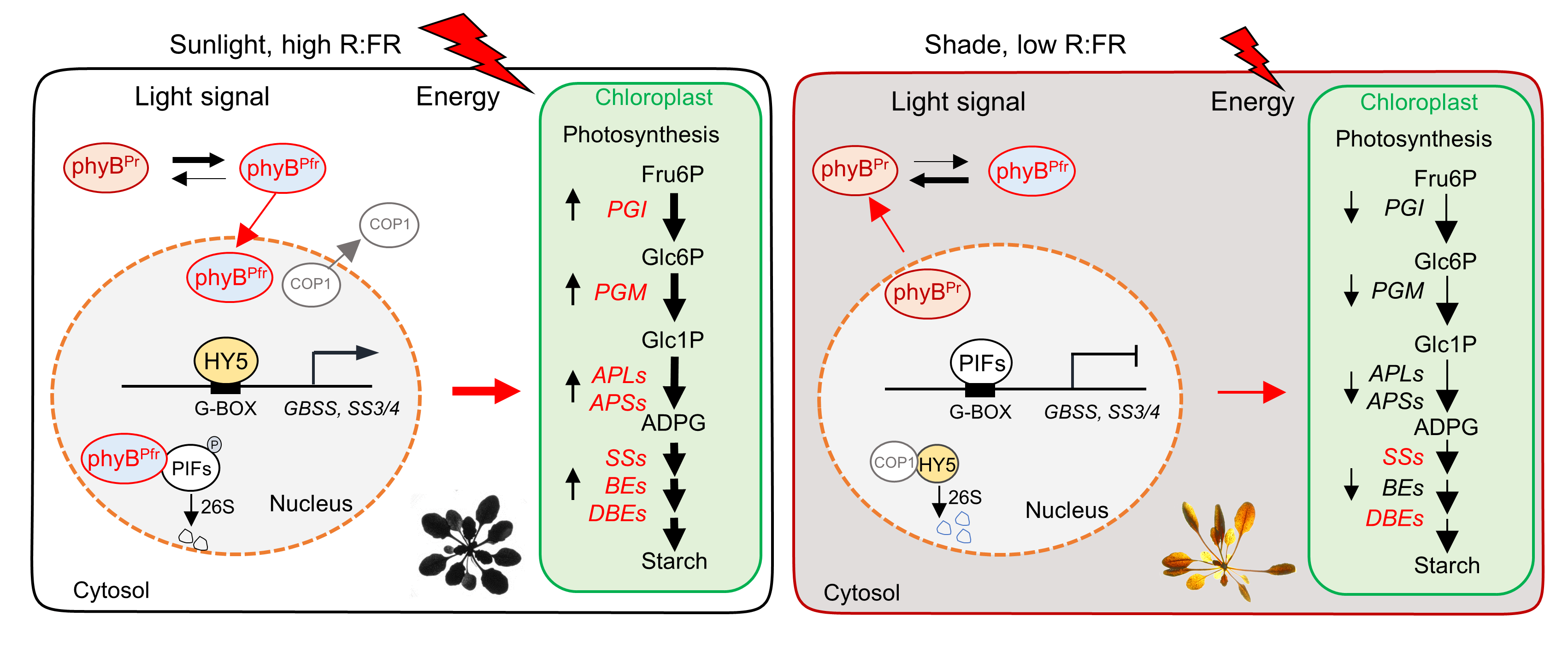該研究探索了植物如何通過光受體phyB及其下游因子,精準調控淀粉合成過程,以響應不斷變化的環境信號。這項研究揭示了光信號特別是紅光和遠紅光(R:FR) 比例的變化,直接影響擬南芥葉片中的淀粉合成。植物通過光受體,如phyB,感知環境中R和FR的比例變化,這種比例的變化是植物判斷周圍是否有其他植物遮蔭的重要依據。在high R:FR環境條件下,phyB被激活,轉錄因子HY5大量積累,促進GBSS/SS3/SS4等淀粉合成基因的表達,從而加速淀粉的積累。而在low R:FR情況下,PIFs轉錄因子成為主導,抑制淀粉合成基因的表達,進而降低淀粉的產生。這一過程中,HY5與PIFs通過競爭性地結合到淀粉合成基因GBSS/SS3/SS4啟動子區域的同一G-box順式元件上,形成了一種精巧的拮抗調控機制。