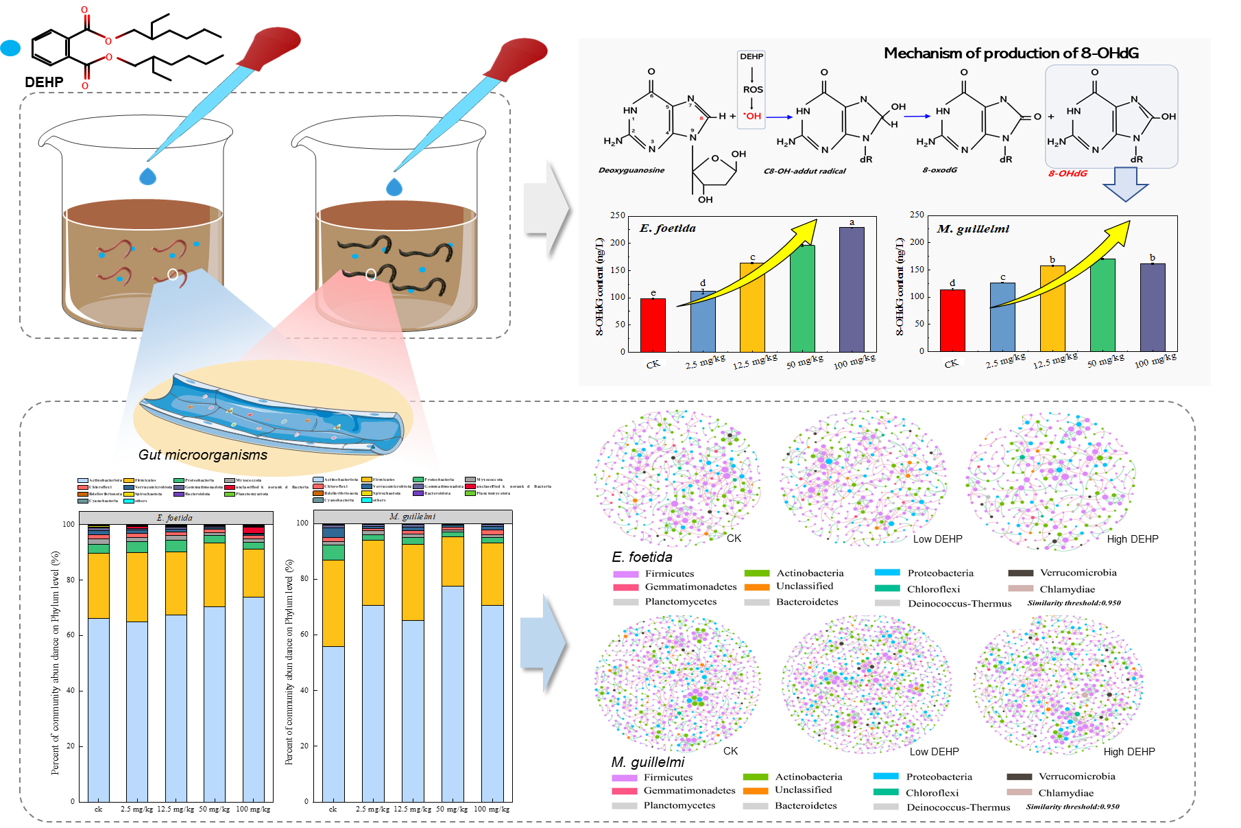 研究結果表明,DEHP顯著誘導了Eisenia foetida(表棲型)和Metaphire guillelmi(內棲型)體內的8-羥基脫氧鳥苷(8-OHdG)含量,從而導致細胞內DNA損傷。同時DEHP對功能基因(ATP-6、NADH1、COX)的表達產生負面影響,在基因水平上擾亂線粒體呼吸和誘導氧化應激。盡管兩種蚯蚓腸道表現出相似的優勢菌群,而DEHP的加入均能顯著抑制腸道微生物的均勻度和多樣性,并進一步破壞腸道微生物生態網絡的穩態。研究強調了在評估土壤生態健康和進行環境毒理學分析時需要考慮不同物種的綜合生物學效應。