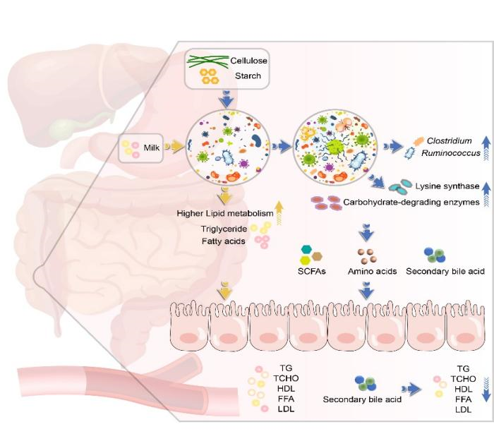 腸道微生物在畜禽出生后立即在腸道定植,宿主和微生物之間建立了共生關系,互惠互動經常影響宿主的生理和健康。本研究對關鍵生長階段的兔腸道菌群及其代謝物進行了縱向分析。通過整合宏基因組和代謝組學數據,闡明了微生物群的初始定植、進化和成熟,全面描述了微生物組的功能譜和代謝產物,評估了微生物結構和多樣性變化的功能結果。研究表明,60日齡前,家兔微生物群落和功能基因的多樣性和豐富度總體上呈增加趨勢;飼料的攝入是影響兔腸道微生物組成的重要驅動因素;梭菌屬和瘤胃球菌屬在飼料階段的相對豐度顯著較高;此外,飼料中的淀粉和纖維促進碳水化合物降解酶的分泌,有助于宿主適應飼糧變化。兔腸道菌群可合成賴氨酸,且在母乳到飼料變更后賴氨酸合成酶逐漸增加。新生兔腸道菌群具有較高的脂質代謝豐度,有助于宿主從母乳脂質中獲取更多能量。母乳到飼料變更后,兔腸道菌群還可以合成多種次級膽汁酸調節宿主脂代謝。