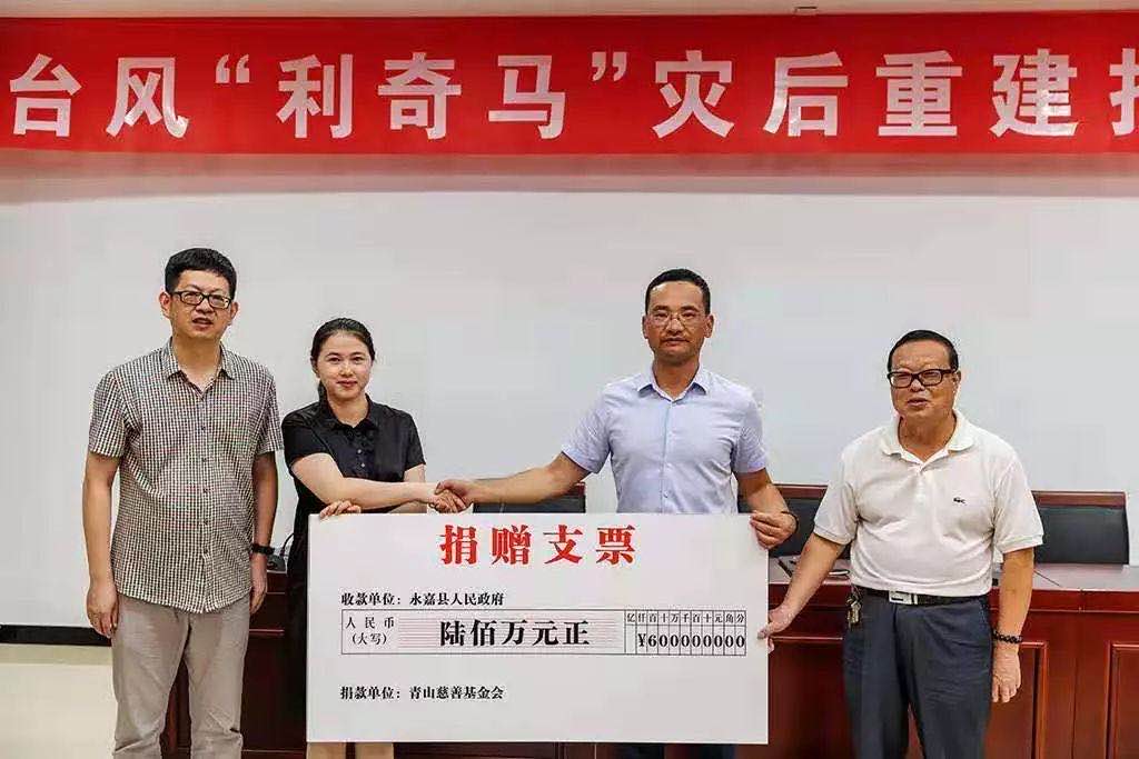 2019年8月10青山實業(yè)向永嘉災區(qū)捐款600萬